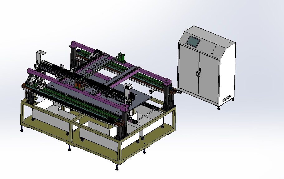 自動(dòng)排版機(jī)的主要功能單元有:玻璃輸送定位系統(tǒng)、抓取行走系統(tǒng)、視覺檢測系統(tǒng)、電控系統(tǒng)等;通過以上功能單元,實(shí)現(xiàn)了將自動(dòng)串焊機(jī)串焊好的電池串,按照工藝尺寸要求和排版方向順序自動(dòng)排版鋪設(shè)到玻璃(EVA已經(jīng)鋪設(shè))上,組成電池串陣列。玻璃/EVA通過傳輸線傳輸至指定位置,機(jī)械手抓取電池串實(shí)現(xiàn)CCD定位、自動(dòng)旋轉(zhuǎn)、自動(dòng)排版功能。設(shè)備通過同步帶傳輸與自動(dòng)生產(chǎn)線對接,實(shí)現(xiàn)了自動(dòng)流水作業(yè)。
